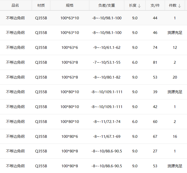 Q355B不等邊角鋼100*63*10現(xiàn)貨表